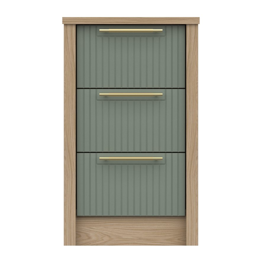 This stylish bedroom range has a stunning oak carcass. Doors and drawers are painted in a choice of either green or blue, and have a ribbed design. For ease and convenience, this range has soft close fittings and easy glide metal runners for drawers. All products are Essex made and arrive fully assembled, except for the tall wardrobes which arrive flat packed for stress free delivery.